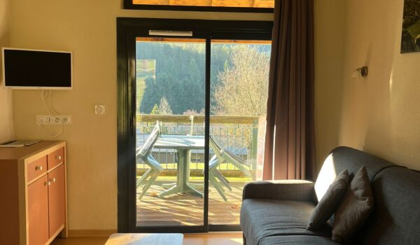 Un coin salon avec terrasse pour profiter du soleil et une cheminée pour les soirées d’hiver.